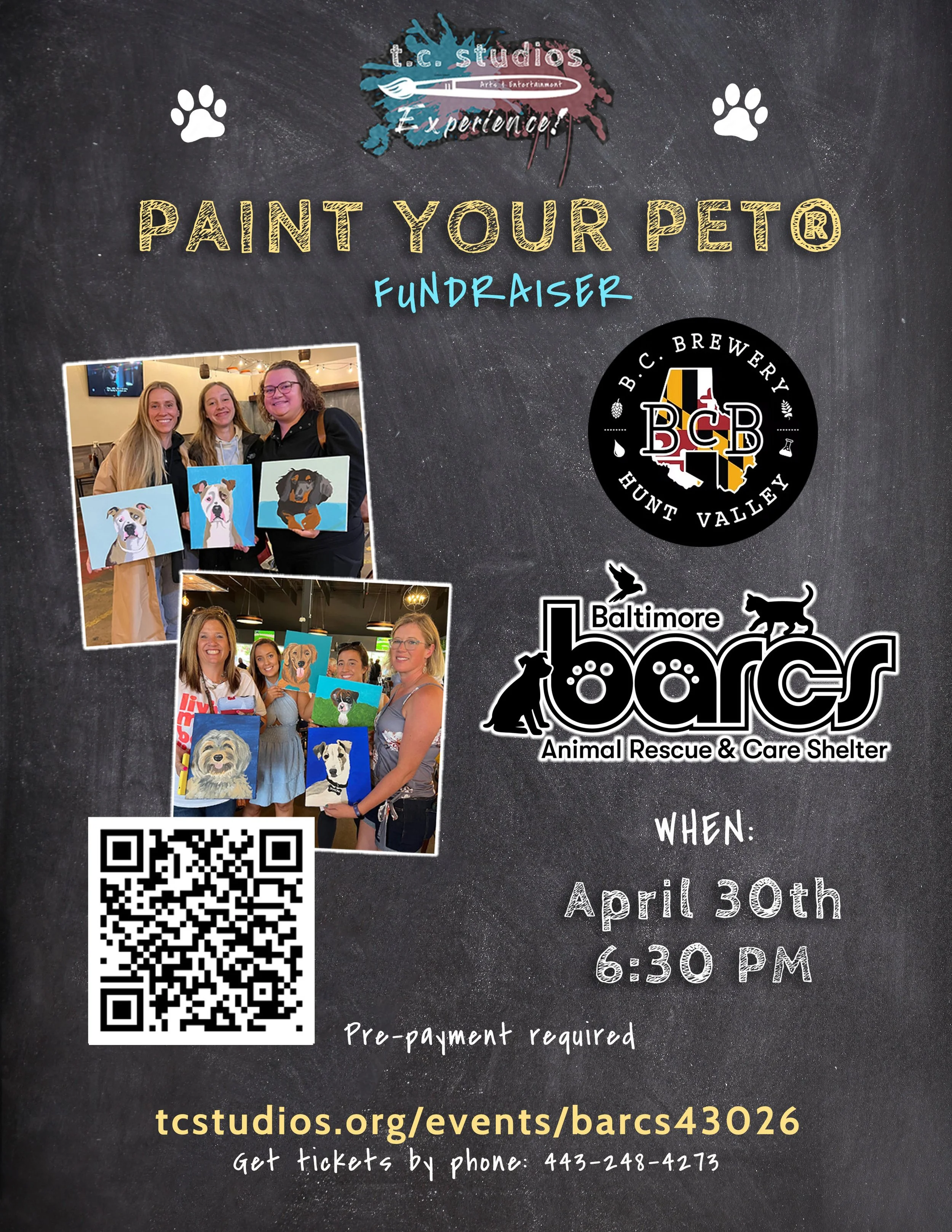Sip and eat while painting a PET PORTRAIT at BC Brewery in Hunt Valley, MD, to benefit BARCS! No artistic experience is necessary—each canvas and portrait will be pre-sketched for participants’ convenience. Pre-registration is required. Tickets can be purchased below or by contacting T.C. Studios at 443-248-4273.